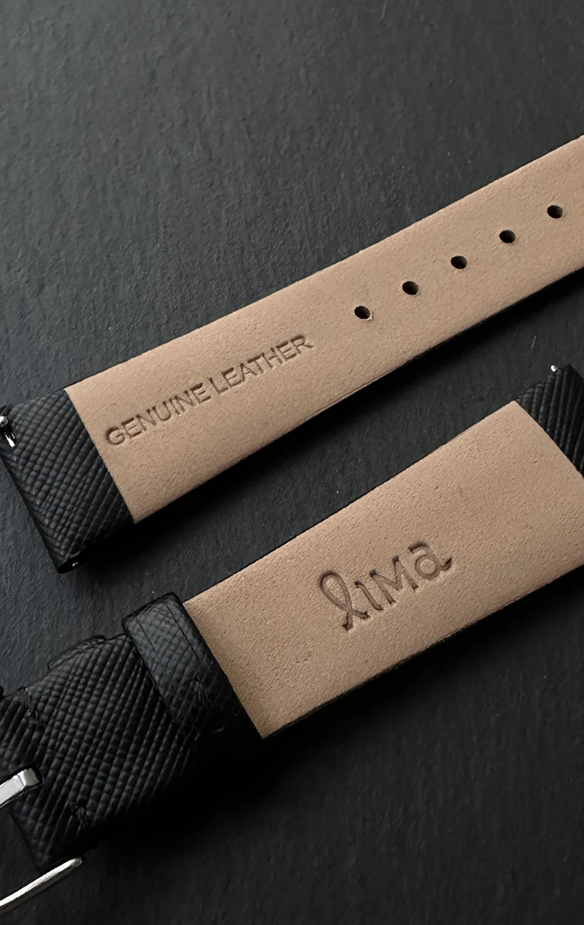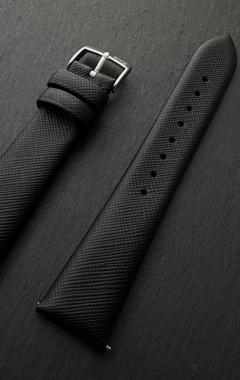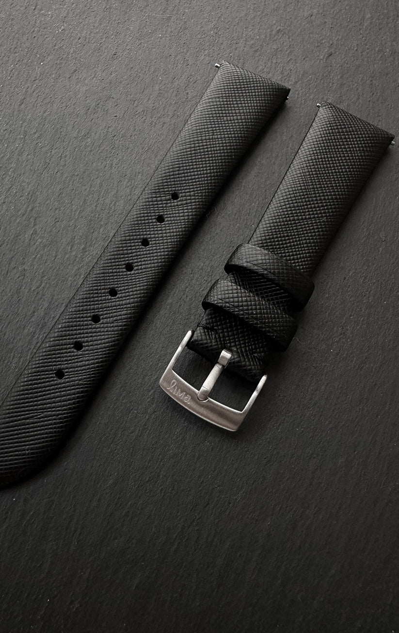 A tapered saffiano strap 20mm width, tapered to 18mm.